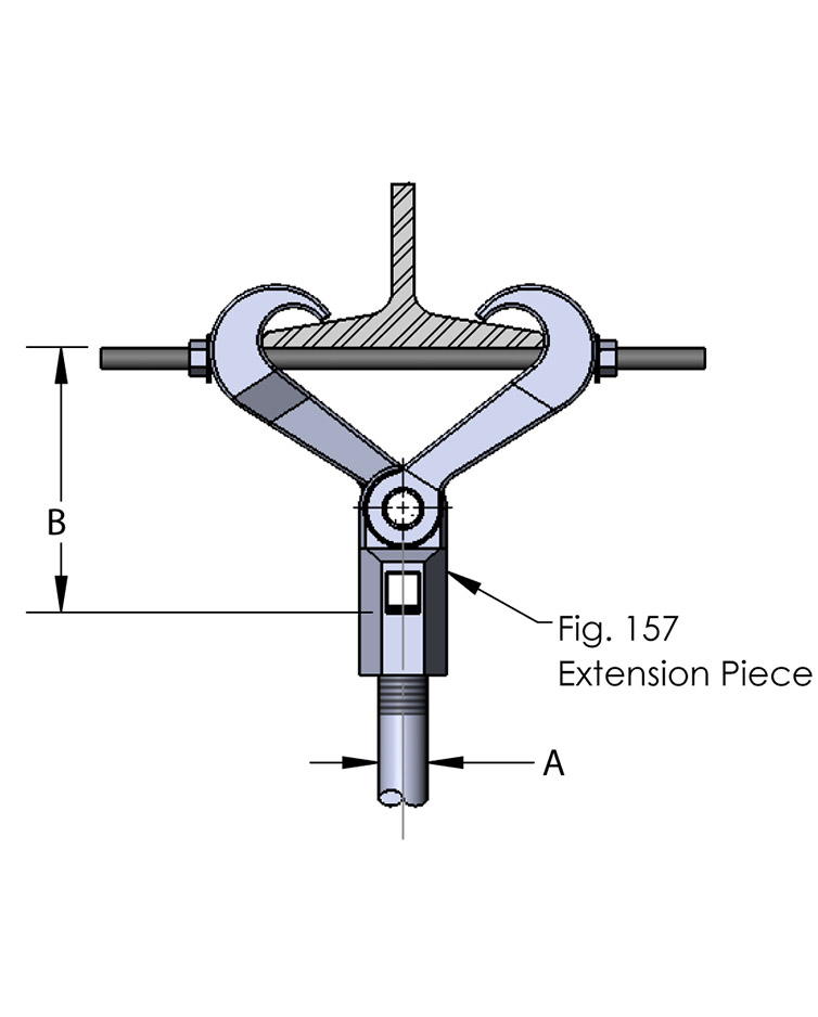 Designed for the suspension of a hanger rod from the center of an I-beam. The clamp accommodates flange widths of 2 3/8" - 7". Flange thickness not to exceed .60 inches. Normally used in conjunction with figure 157 extension piece. Figure 157 provides 1" of vertical adjustment.