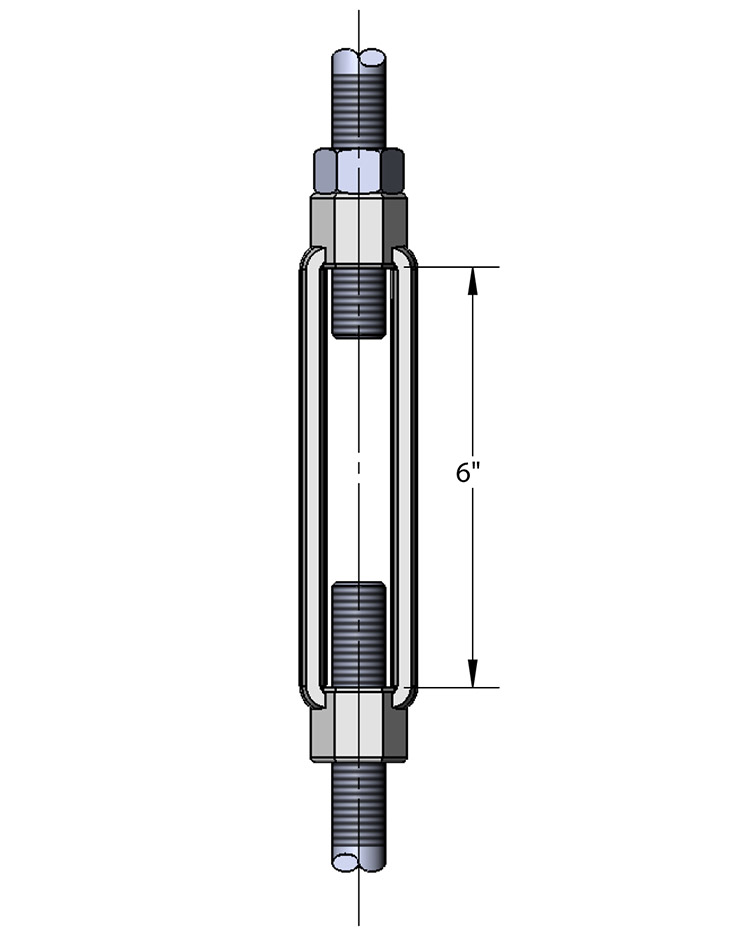 Hanger rod connector, tapped right hand x left hand thread to provide up to 6 inches of adjustment. Normally tapped for UNC-2A thread (standard).