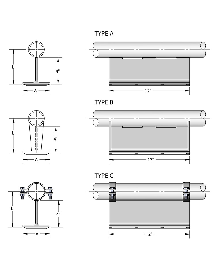 Carbon steel tee with or without PTFE slide pad, also available in 304 and 316 stainless steel.