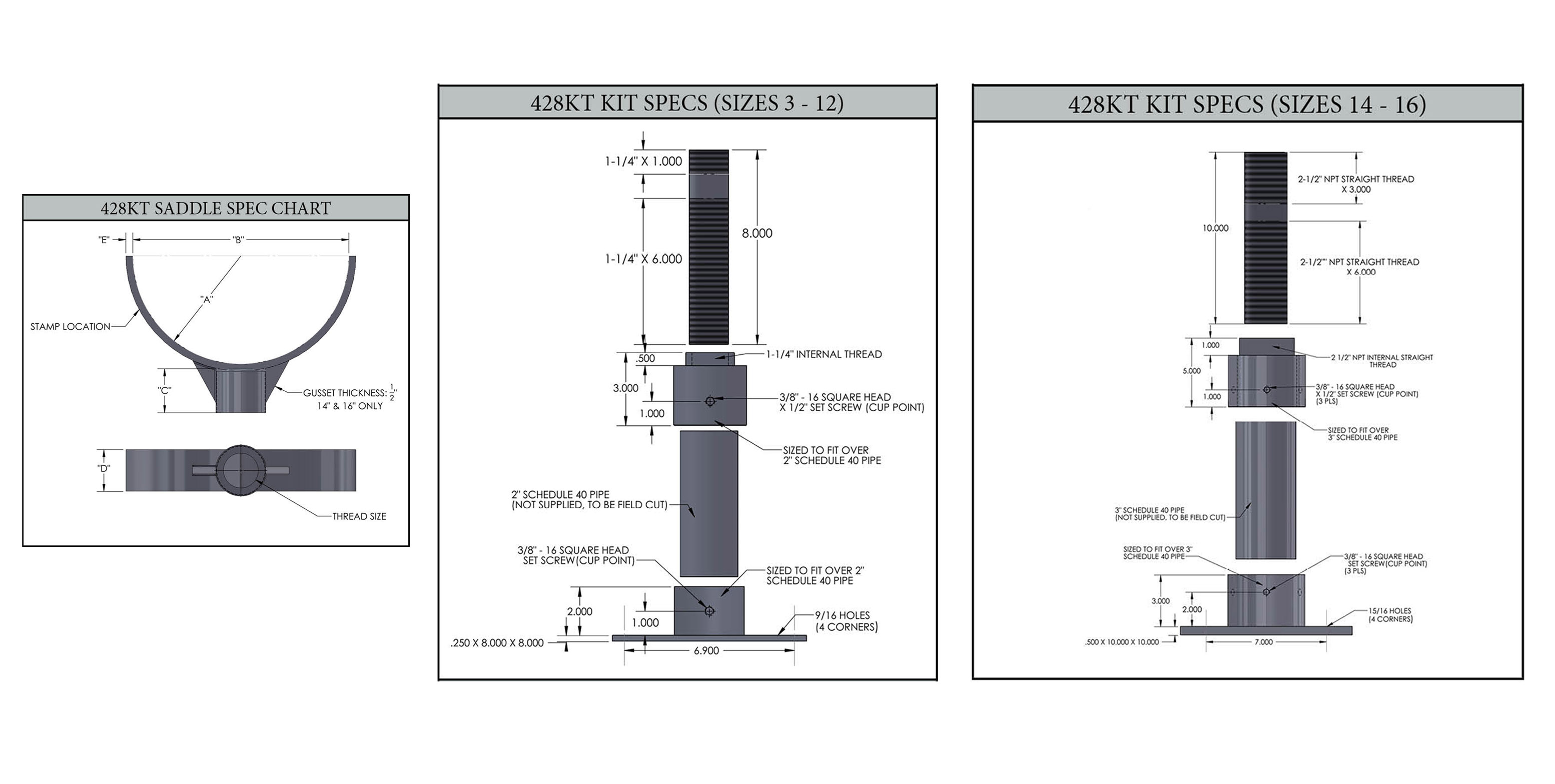 Saddles accommodate ductile iron pipe and IPS. Support requires 2" schedule 40 extension pipe to be cut in the field. Factory System Tested to 11,000 Lbs (Support Must Be Properly Aligned to Piping System)