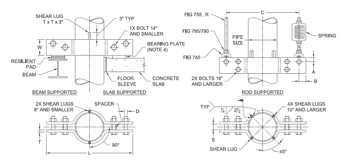 Designed to support vertical piping from hanger rods or structural members such as beams and concrete slabs. Shear lugs field welded to pipe wall transfer pipe load to riser clamp.