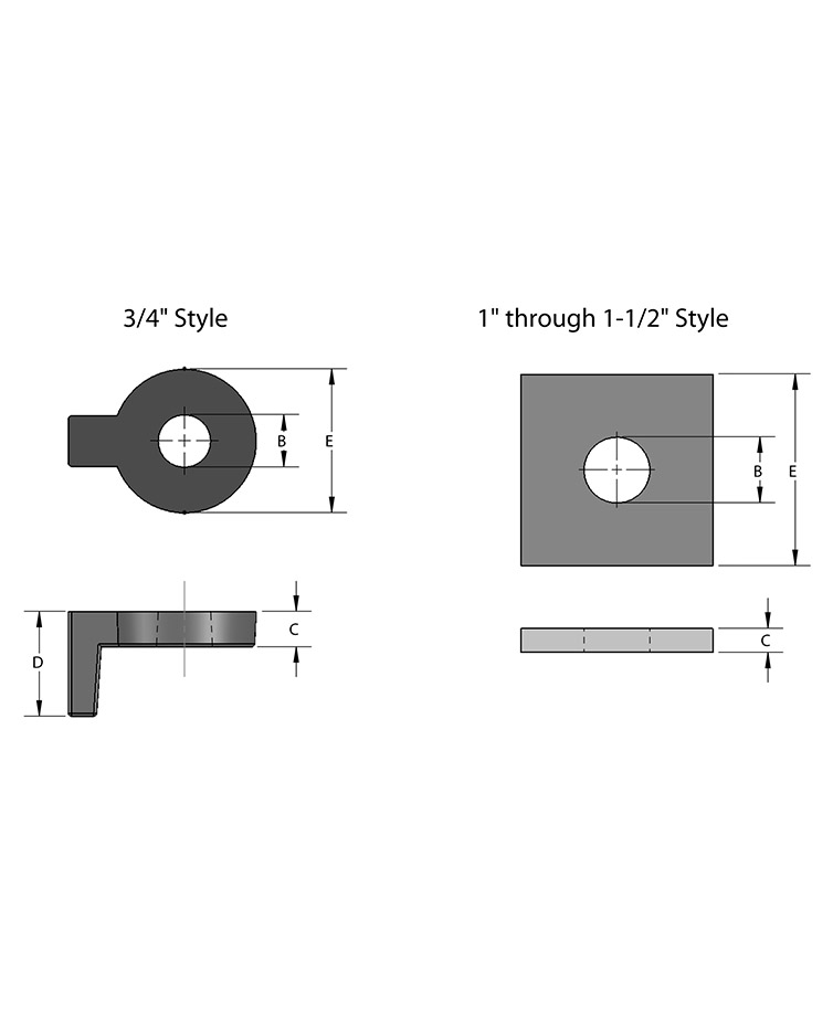 The 3/4" rod size socket clamp washer is a cast iron product with tab feature. This accommodates pipe sizes 4"-12". The 1"-11/2" rod size washer are a carbon steel flat style. these accommodate pipe sizes 14"-24".